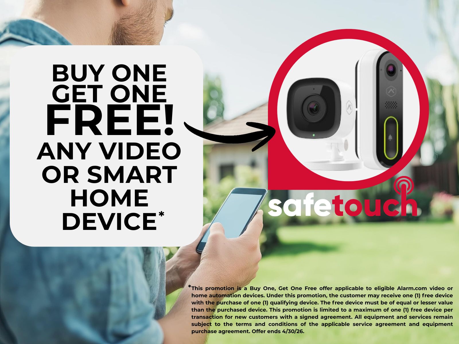 This promotion is a Buy One, Get One Free offer applicable to eligible Alarm.com video or home automation devices. Under this promotion, the customer may receive one (1) free device with the purchase of one (1) qualifying device. The free device must be of equal or lesser value than the purchased device. This promotion is limited to a maximum of one (1) free device per transaction for new customers with a signed agreement. All equipment and services remain subject to the terms and conditions of the applicable service agreement and equipment purchase agreement. Offer ends 4/30/26